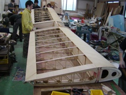 M-01の内外翼は木製で、その上にフィルムが貼ってある。写真は内翼の構造体。