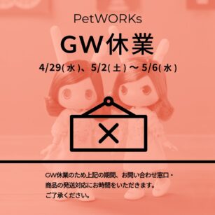 5月2日(土)~5月6日(水) 上記の期間、ペットワークスGW休業の為、ペットワークスドール事業部のお問い合わせ窓口、及びペットワークスストアのお問い合わせ窓口と商品の発送対応にお時間をいただきます。