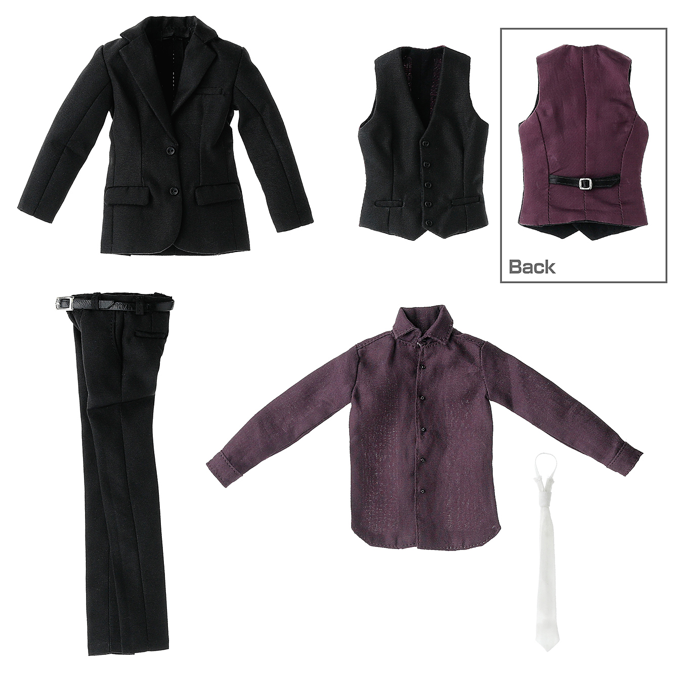 内容: ジャケット、ベスト、ベルト付きスラックス、シャツ、ネクタイ