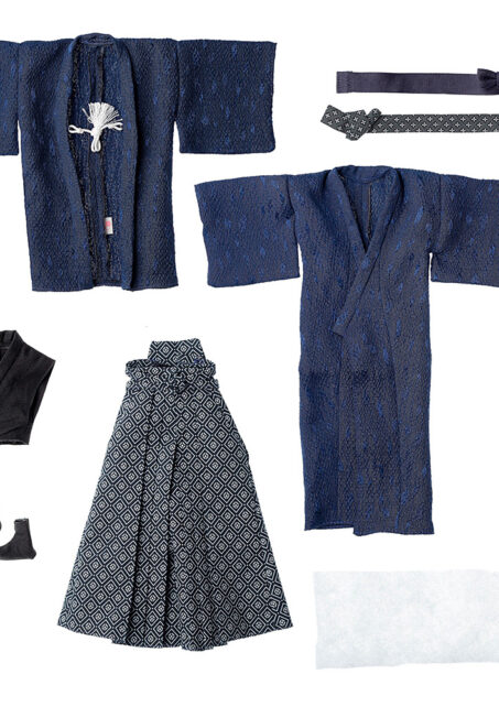 内容: 羽織、長着、袴、足袋、肌着、袴用無地帯、長着用小紋柄帯、補正用キルト芯、着せ付け説明書。