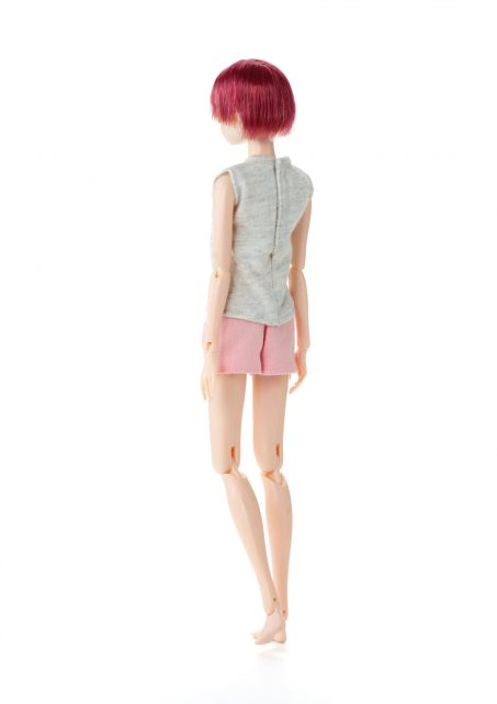 仕様詳細: ハニーフェイス、モーブピンクの瞳の横目(上マツゲ2本)、ダークブラウンのアイシャドウ、ヌードオレンジのスマイルリップ。ワインレッド×ディープブロンドのシャギーショート。色白肌にクリアピンクのネイル。