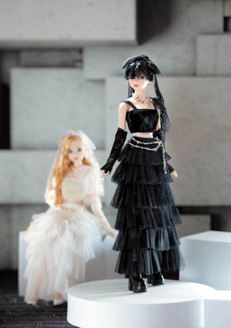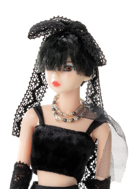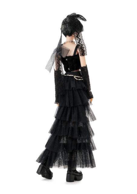 内容: PW-momoko本体、ベロアトップス、チュールフリルティアードスカート、ペチパンツ、レースグローブ、ネックレス、チェーンベルト、レースリボン、厚底ブーツ(STOC)。
