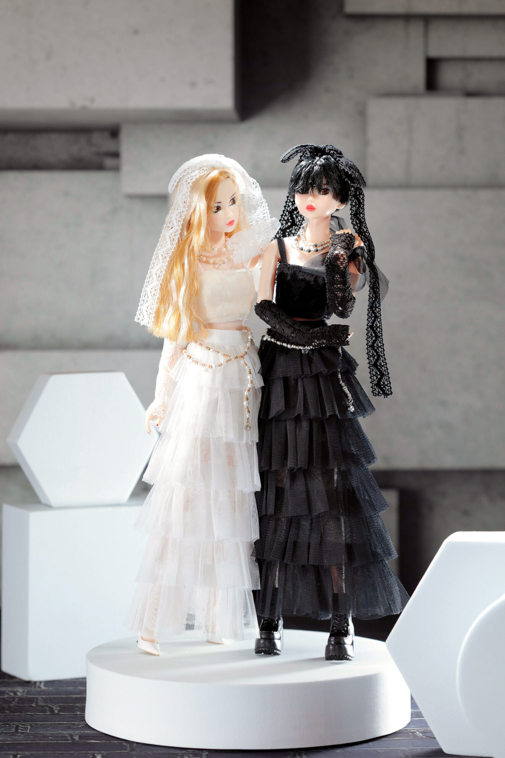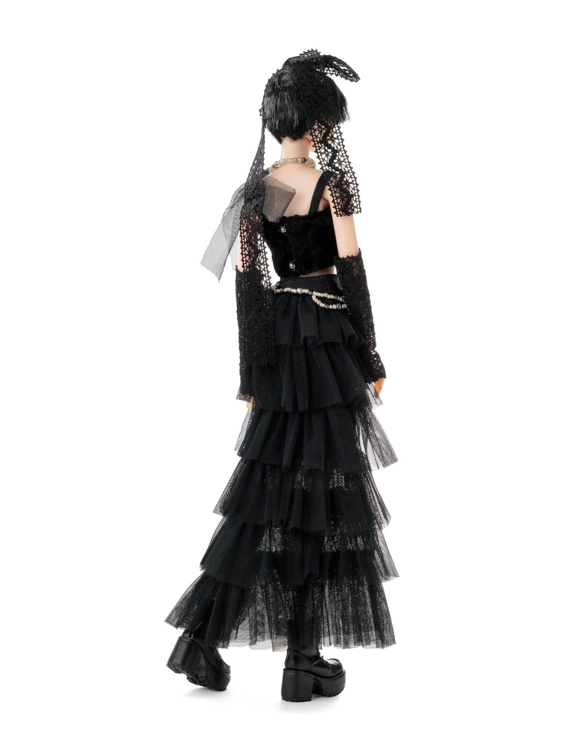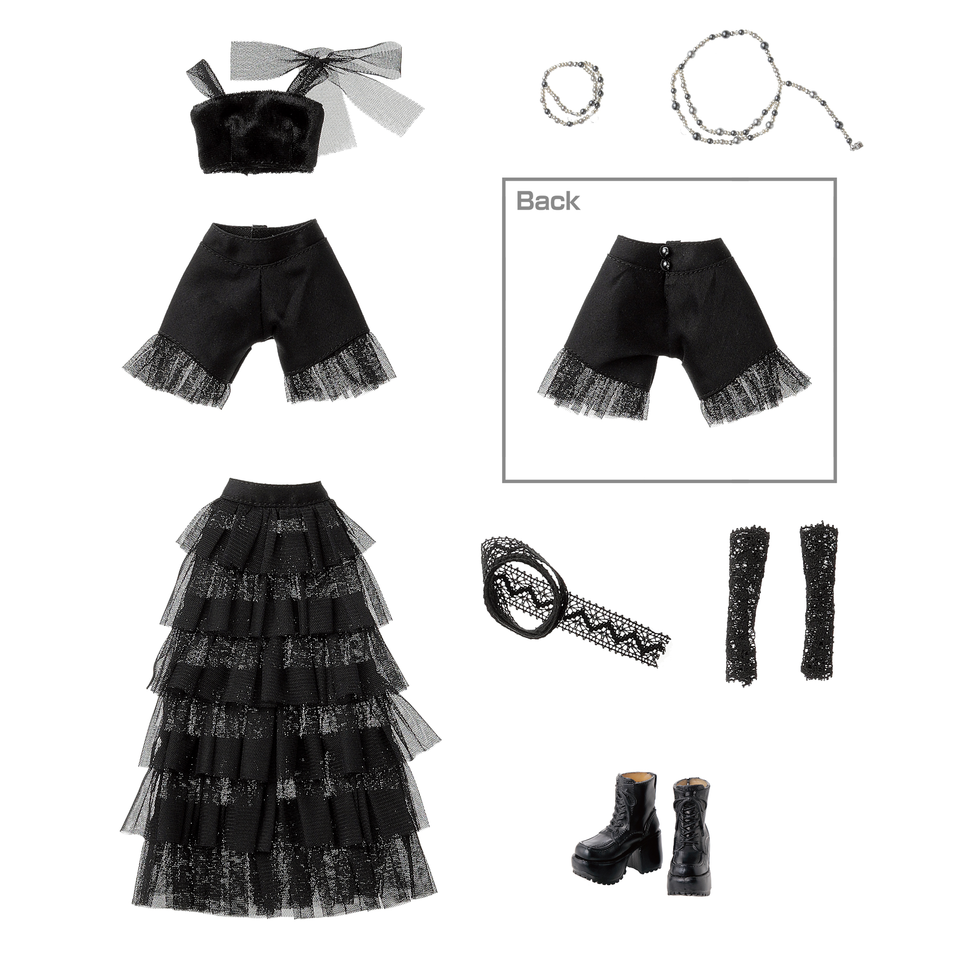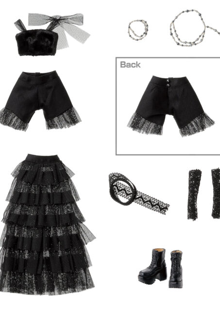 内容: PW-momoko本体、ベロアトップス、チュールフリルティアードスカート、ペチパンツ、レースグローブ、ネックレス、チェーンベルト、レースリボン、厚底ブーツ(STOC)。